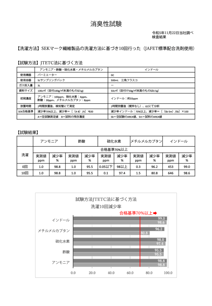 5大排泄臭(アンモニア、酢酸、メチルメルカプタン、硫化水素、インドール)に関して、適正機関の消臭性検査をクリア