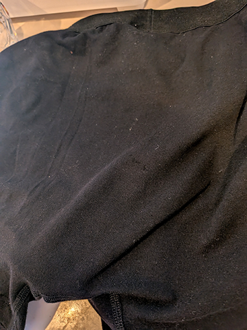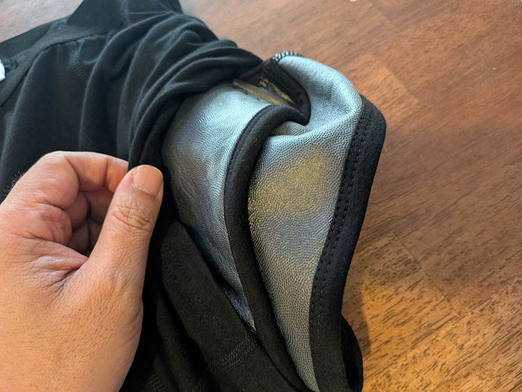 しかし、太もも部分やお腹部分の隙間から、臭いが漏れ出ては意味が無いので臭いを包む感じで外に出さない構造らしい。