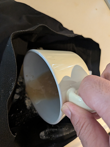 躊躇せず、一気にオマパンのお尻の部分に味噌汁を注ぎ込みます。